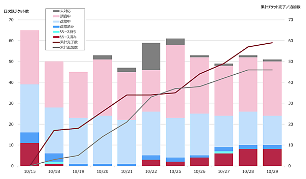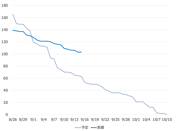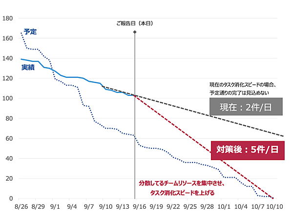 もし、バーンダウンチャートを作成した人が「進捗会議はプロジェクトを納期通りに進行するために、各部門の改善策を議論することが目的である。だから、このチャートによって現状が伝わらなければならない」と理解できていたらどうでしょう。