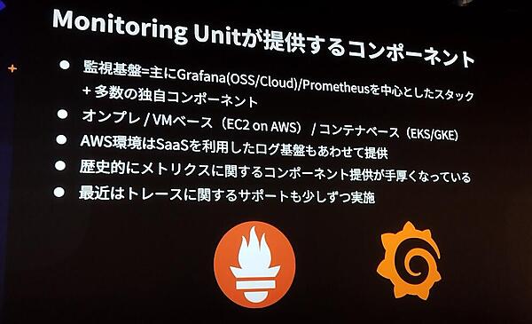 EKS/AWSではオープンソース版のGrafanaを、GKE/GCPではGrafana Cloudを活用し、同じユーザー体験を提供することがモニタリングユニットの発想であったことが紹介された。これにより、インフラストラクチャーが異なっても、統一された観測性を維持することを目指したチームの取り組みが強調された。