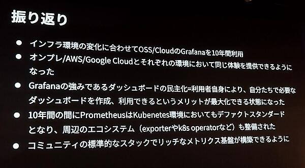 また、Grafana/Prometheusスタックを採用した理由や、マルチクラウド環境への適応、長期間の運用で直面した課題とその対応策について語られた。