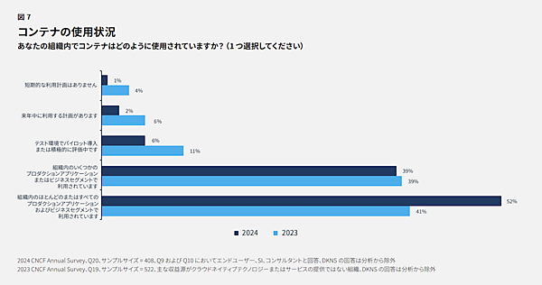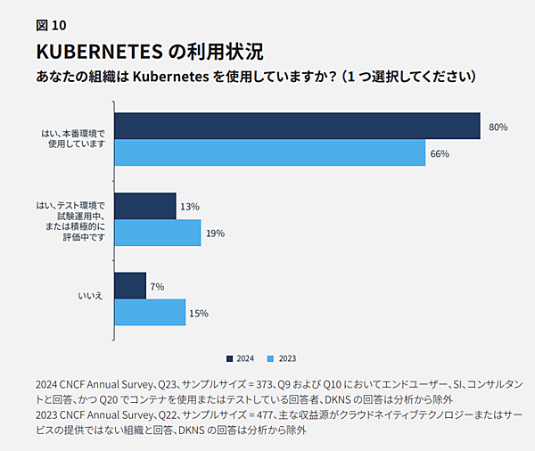 2024年にはKubernetesの本番環境での利用率が80%に達し、2023年の66%から20.7%の大きく成長しています。