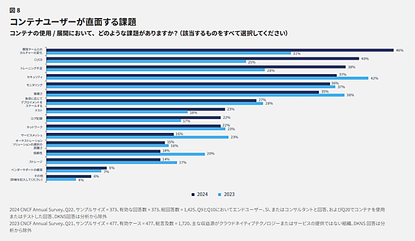 しかしながら、コンテナ利用に関して、さまざまな課題が挙げられています。2023年はセキュリティ(42%)と複雑さ(38%)が最大の課題でしたが、今回の調査では開発チームとのカルチャーの課題が46%で最大の問題とされ、CI/CDやトレーニング不足も重要な課題として挙げられています。ちなみに、前回の大きな課題であったセキュリティや複雑さは減少しています。