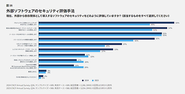 2023年と比較して、ソフトウェアのセキュリティ向上が著しく、活発なコミュニティの確認が60%に達しています。具体な評価手法として、プロジェクトに活発なコミュニティが存在することを確認している割合は60%で、2023年の49%から増加しています。また、既知の脆弱性を持つオープンソースパッケージを検索するためのツールを使用している割合は57%で、2023年の51%から増加しました。