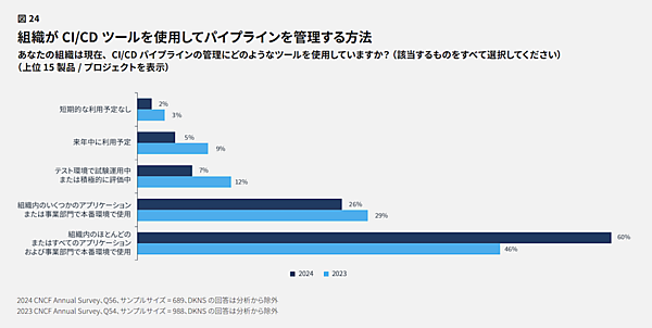 最後に、継続的インテグレーション(CI)と継続的デリバリー(CD)の手法について記述されています。これらの手法が多くの組織で採用されており、2024年には使用率が大幅に増加していると報告しています。具体的には、60%の組織がほとんどのアプリケーションでCI/CDツールを使用しており、2023年の46%から2024年には60%に増加。CI/CDツールの使用率が全体的に成長しています。