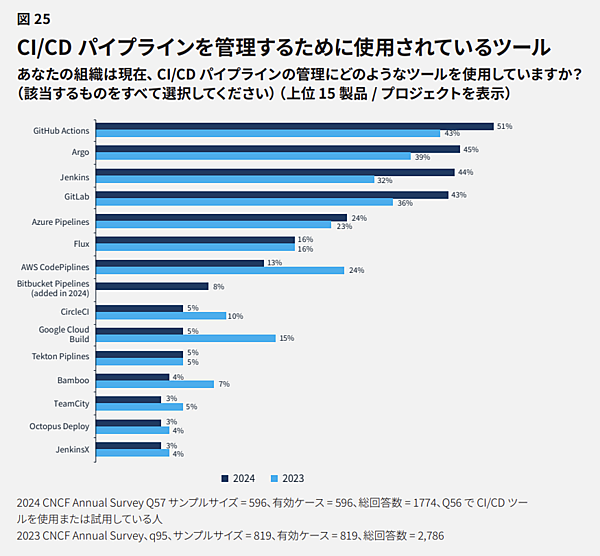 上図にあるように、GitHub Actions、Argo、Jenkinsなどが上位にランクされています。また、これらの使用率もGitHub Actionsが19%増加、Jenkinsが40%増加、GitLabが20%増加、Azure Pipelinesは3%の増加などと大きく成長しています。