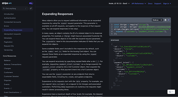 Stripeは、開発者が簡単にAPIを利用できるようにドキュメントの設計に力を入れています。APIの仕様書は分かりやすく、実際のコード例も豊富に掲載されています。最近ではよく見られる3カラム構成のドキュメントは、Stripeが先駆けて導入したものです。