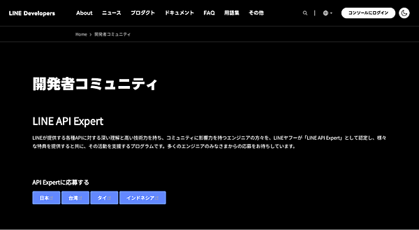 LINEはLINE API Expertというプログラムを運営し、LINEのAPIを活用している開発者を支援しています。現在では、日本のみならず台湾やタイ、インドネシアなどの地域にも展開されています。API ExpertはLINEの技術に精通し、コミュニティでの活動を通じてLINEのエコシステムを広げる役割を担っています。