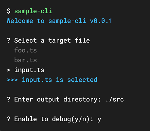 sampleCli.tsファイルを実行すると、以下のように質問が表示され、入力に基づいた結果を出力できます。