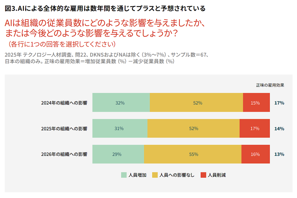 本レポートでは、企業はAIの導入に対応して実際にIT労働力が拡大しています。下図に示されるように、全体的な雇用効果は2026年までに2024年の17%から2026年の13%の幅でプラスを維持することが予測され、技術系人材に対する雇用市場の競争が激化しています。