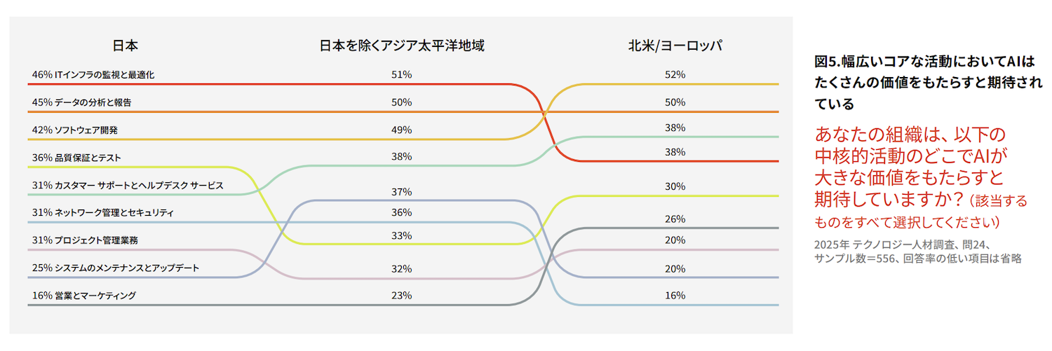 これとは対照的に、北米とヨーロッパでは重点項目が異なり、52%がAIによるソフトウェア開発に大きく期待しています。データ分析やレポーティングは全地域で一貫して優先度が高く、北米/ヨーロッパとアジア太平洋地域がともに50%、日本が45%となっています。この項目がどの地域でも優先度が高いのは、データをアクションにつながる分析を行うことで、意思決定プロセスを改善するというAIの活用方法が広く認知されているからであると考えられます。