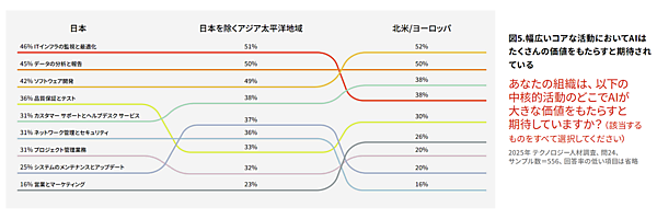 AIがITのモダナイゼーションを推し進める中、世界中の組織においてAIがあらゆるコア業務で多くの恩恵をもたらすことが期待されているというデータが得られました。下図に見られるようにITインフラのモニタリングと最適化が最優先課題であり、日本(46%)およびアジア太平洋地域(51%)では、AIによる大きな効果が期待されています。前述のように熟練労働力の不足に対応するため、アジア太平洋地域ではインフラの最適化に重点が置かれていると考えられます。