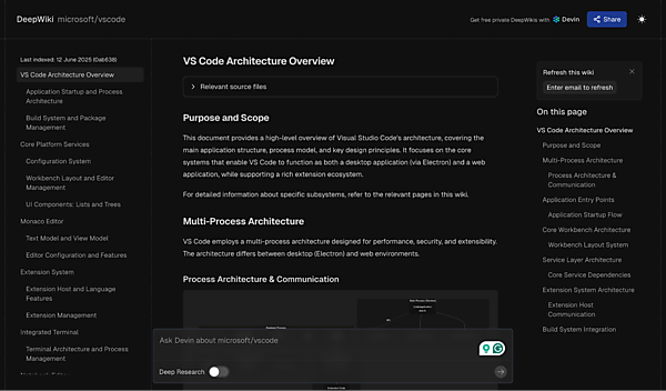 開発者にフォーカスしたコンテンツ生成としては「DeepWiki」が挙げられます。DeepWikiは開発者向けの技術ドキュメントをAIが自動生成するサービスで、特にAPIドキュメントやSDKの説明に強みを持っています。
