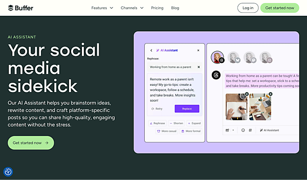 XやFacebookなどのソーシャルメディア運用においては「Buffer AI Assistant」が一例として挙げられます。コンテンツのアイデア生成、1つのコンテンツを複数のプラットフォーム向けに最適化する機能などが提供されています。