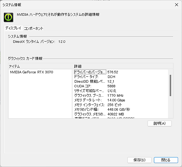 NVIDIA GPUドライバのバージョンは、NVIDIAコントロールパネルから確認できます。「システム情報」を開くと、以下のようにGPUのモデルと「ドライバーのバージョン」が表示されます。