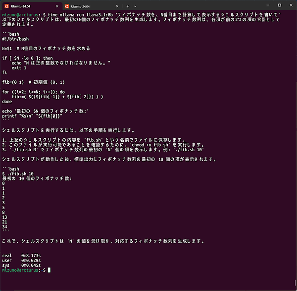$ ollama run llama3.1:8b 'フィボナッチ数を、N番目まで計算して表示するシェルスクリプトを書いて'