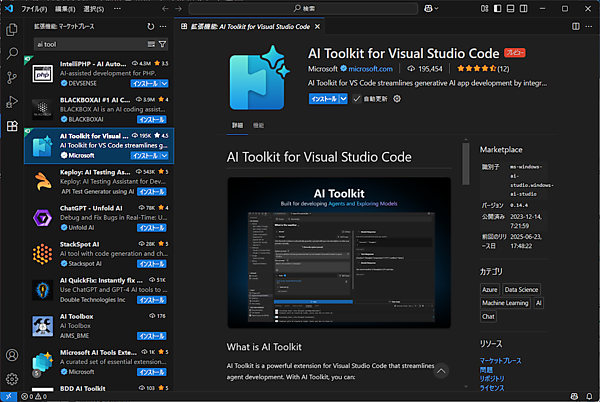 まず、VS CodeにMicrosoft製の拡張機能である「AI Toolkit for Visual Studio Code」をインストールします。