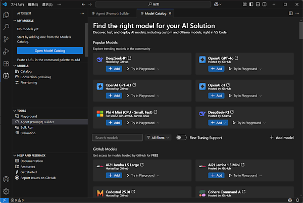 左のアクティビティバーにAI Toolkitが追加されるのでクリックします。続いて「Open Model Catalog」をクリックしてください。AIのモデルを選択する画面が表示されたら「Add model」をクリックします。