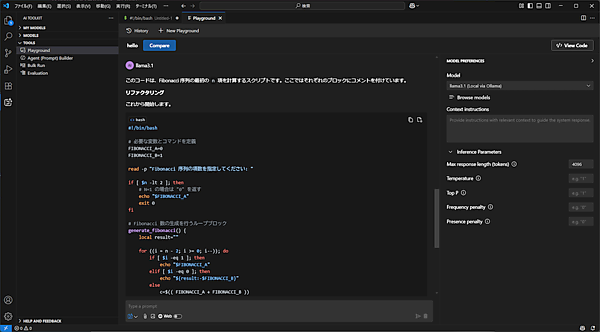 アクティビティバーからAI Toolkitを開いて「TOOLS」→「Playground」をクリックすると、プレイグラウンド画面が開きます。ここで先ほどコマンドラインから行ったのと同様にOllamaと直接対話できます。「Type a prompt」と書かれたテキストボックスに質問を入力して、応答が返ってくるかを確認してください。