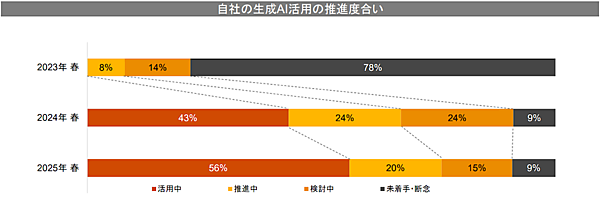 まず、企業における生成AI活用の現在地を、最新データから客観的に見ていきましょう。そこには、導入が加速する「光」の側面と、その裏で進行する「影」の側面が明確に映し出されています。