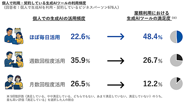 しかし、その一方で、マクロミル調査では生成AIをほぼ毎日個人利用している人の48%が「満足している」と回答しています。
