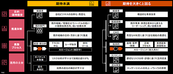 「期待を大きく上回る効果」を挙げた企業は、個人の効率化レベルを超えた事業変革を目指していることが判明。成功企業では「生成AIで自社のビジネスモデルをどう変革するか」という根本的な問いが設定されている。