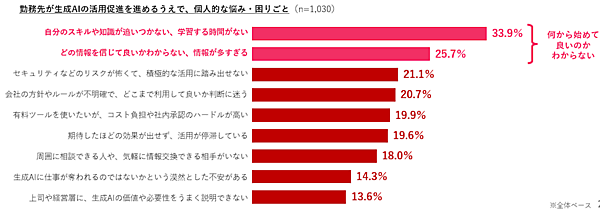【出典】「企業での生成AI活用における課題と可能性」【図表2】勤務先が生成AIの活用促進を進めるうえで、個人的な悩み・困りごと (マクロミル 2025年6月13日)