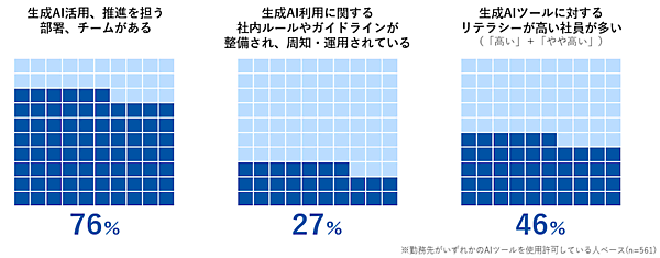 現場が求めているのは「学習機会」と「明確なルール」。推進部署を設置する企業は76%に達するものの実際の利用ルール策定は27%にとどまっており、「禁止」ではなく「安全な活用環境の整備」が成功の分水嶺となっている。