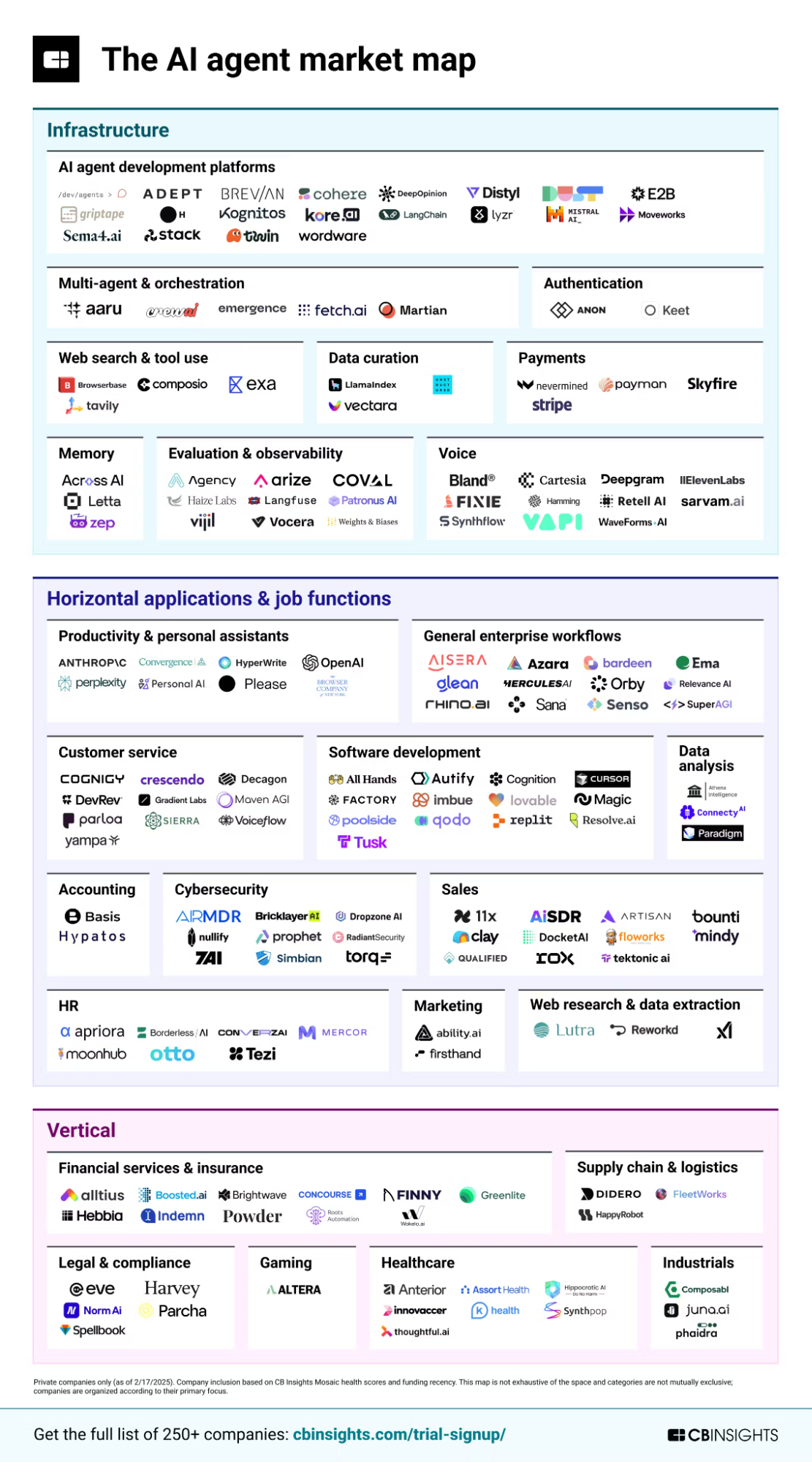 下記に掲載している「AI エージェント の新興市場マップ」を見ると、全体を インフラ(上段:Infrastructure) → 業種・業務横断型(中段:Horizontal applications&Job functions) → 業務特化層(下段:Vertical) の三層ピラミッドで整理できます。まずインフラが土台を固め、その上に業種・業務横断アプリが乱立し、最後に業界特化型が深掘りしていく構図です。