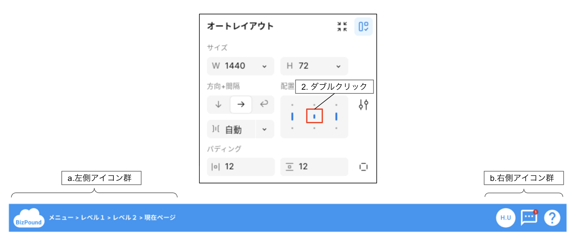 現在、ヘッダーのオートレイアウトの配置は、図18右のように「中央左」になっているので、ヘッダーに挿入したUI要素はすべて左側から並べられています。これを、左側に「ロゴ」と「パンくずリスト」、右側に「ユーザーアイコン」「通知アイコン」「ヘルプアイコン」というように左右に分けて配置します。