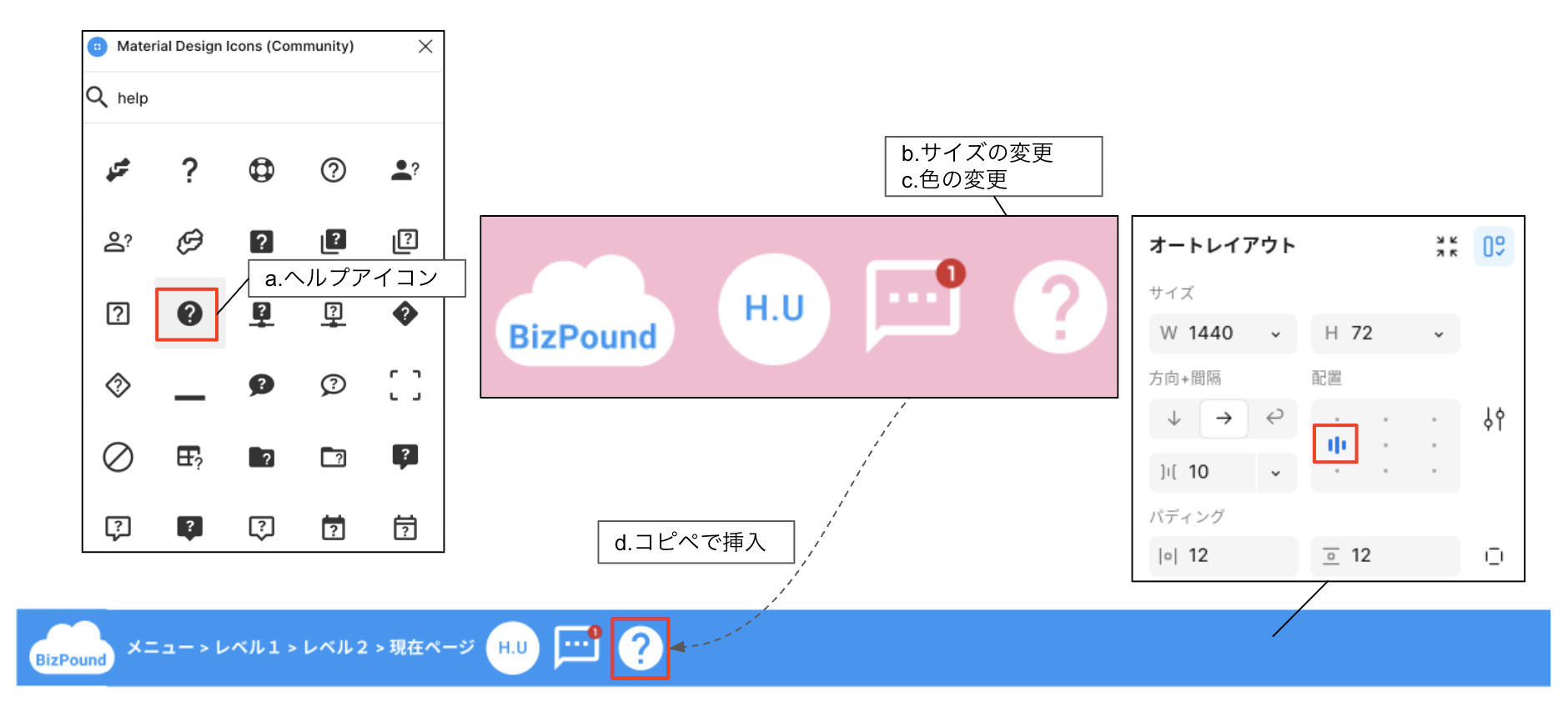 からプラグイン「MaterialDesign Icons」を呼び出し、helpというキーワードで検索してください。今回は図18aのアイコンを反転(inverse)して利用するので、クリックして「アイコン」フレームに落としてください。レイヤーパネルでこれを右クリックしてアイコンの名前を「ヘルプアイコン」とします。