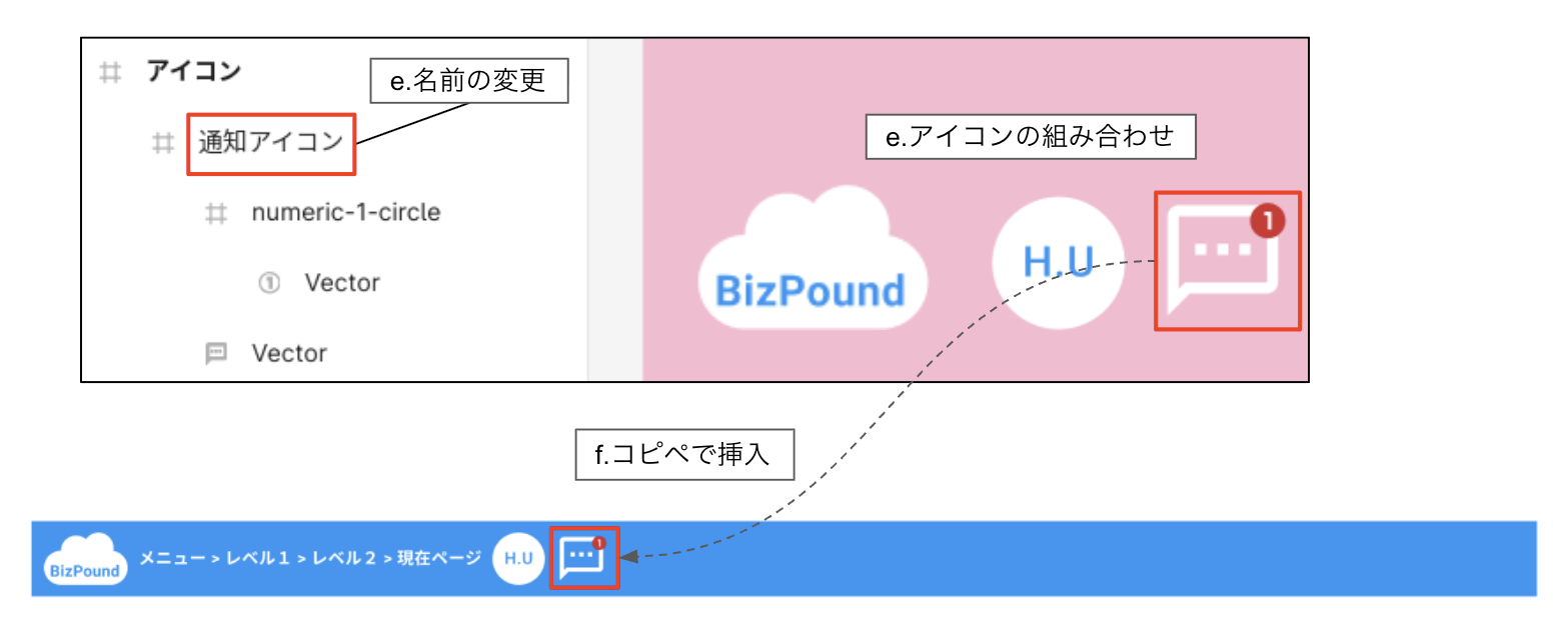 ユーザーアイコンと同じ要領で通知アイコンをコピーして、フレーム「ヘッダー」の上でペーストしてください。図17のようにユーザーアイコンの右横に配置されればOKです。