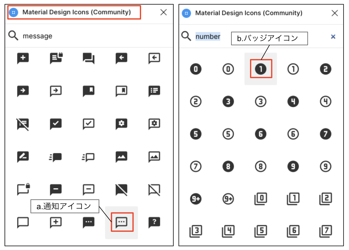 B2Cのアプリでよく使われるバッジは、B2Bの業務システムでもとても便利です。通知が来たことと、いくつ来ているのかを知らせるバッジを通知アイコンに組み合わせたいので、numberというキーワードで再検索して図15bのアイコンを取得してください。