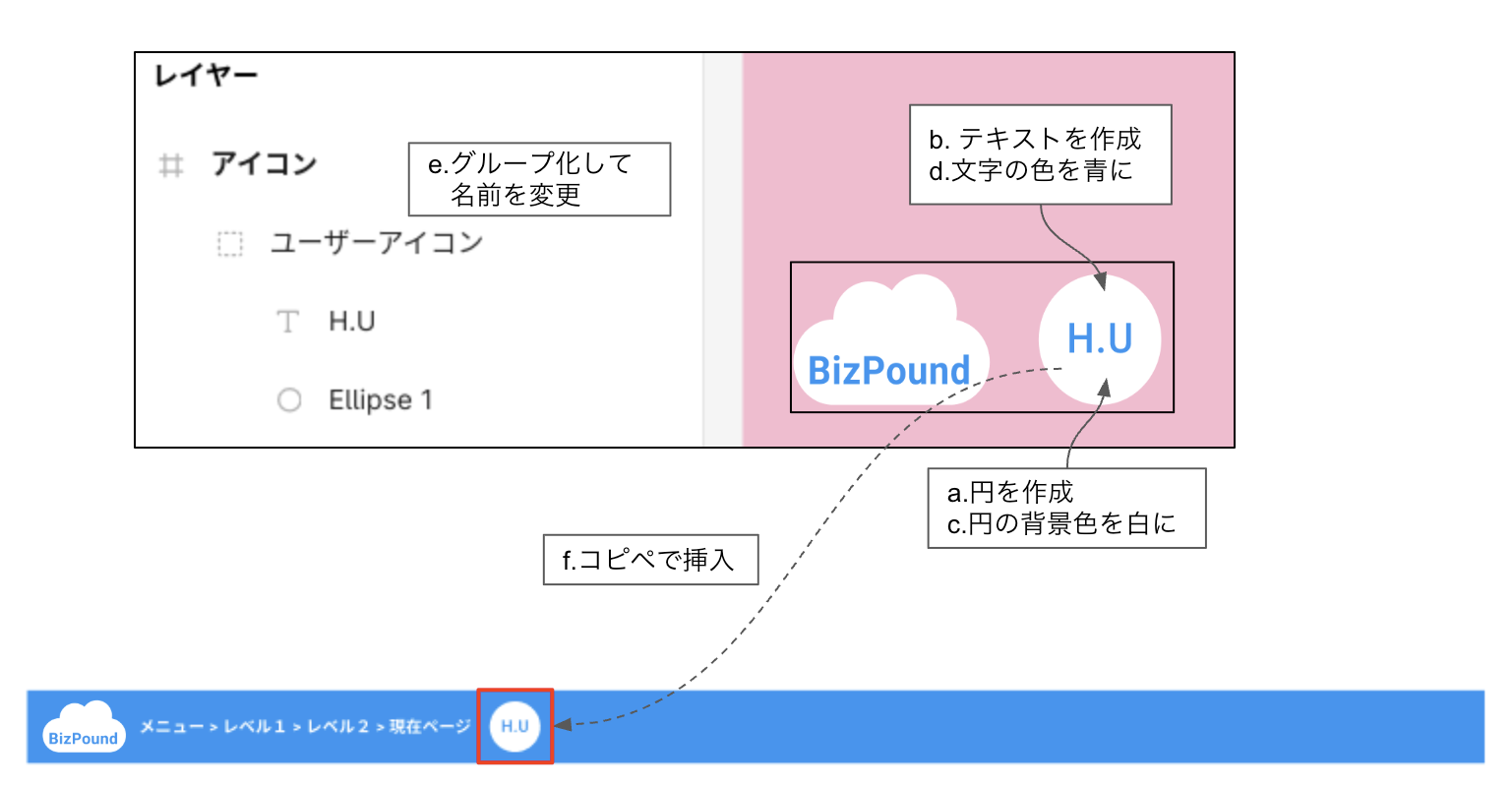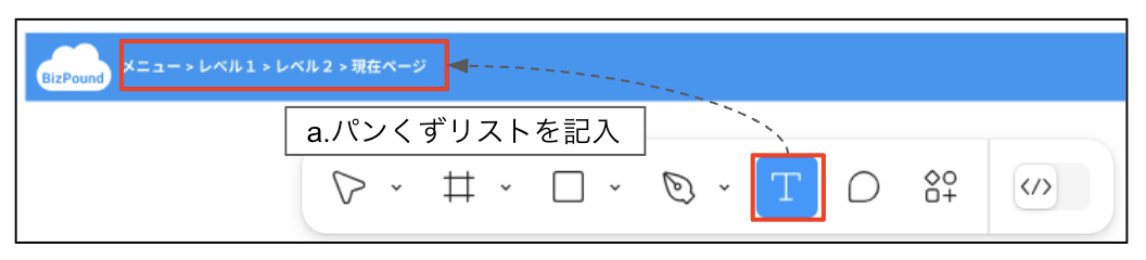 ロゴや円などの図形は、その中にテキストを入れられないため、図の真ん中あたりにテキストを置いてグループ化しました。でも、先ほどのパンくずリストはフレームの中にテキストを書いたら、自動的にフレームの中に含めてくれましたね。
