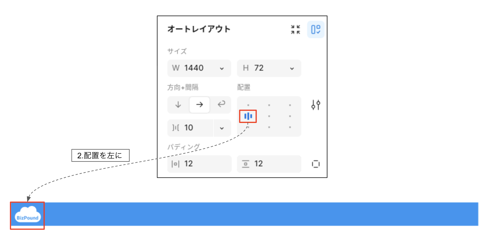 ヘッダーはフッターを基に作ったので、すでにオートレイアウトが設定されています。プロパティパネルで図13のように「配置」を右から左に変更してください。