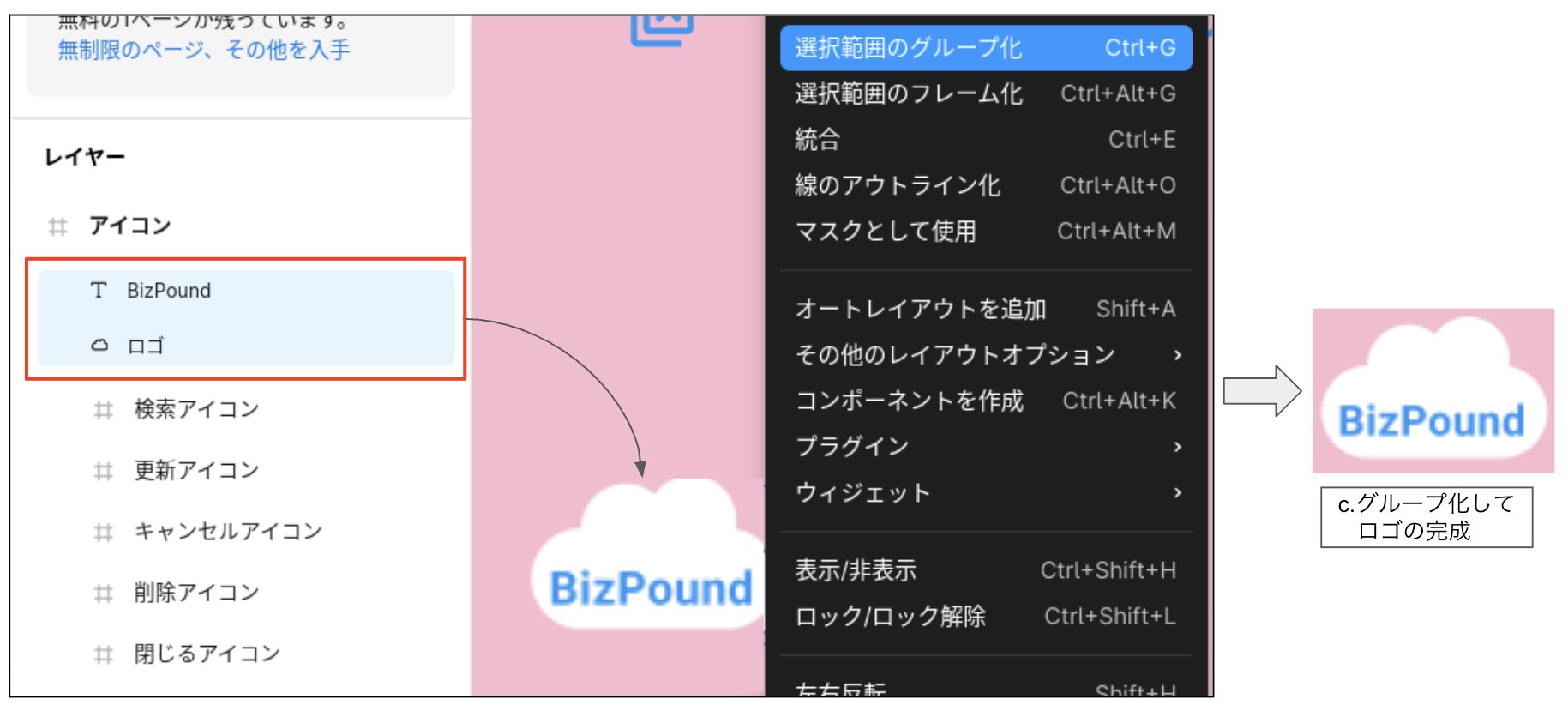 レイヤーパネルのテキスト「BizPound」とベクター「ロゴ」を一緒に選択し、右クリックして「選択範囲のグループ化」を行ってください。Group1というグループが作成され、テキストとシェイプ(図形)が一体化されます。レイヤーパネルでGroup1を右クリックし、グループの名前を「ロゴ」に変更しておいてください。これで図11右のようなロゴが完成します。