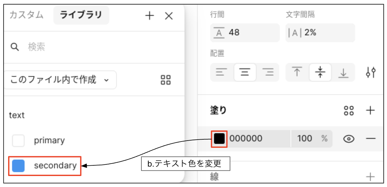 図10のようにテキストのプロパティパネル「塗り」のカラーアイコンをクリックし、ライブラリからtext/secondary(青色)を選んでください。 - c. グループ化