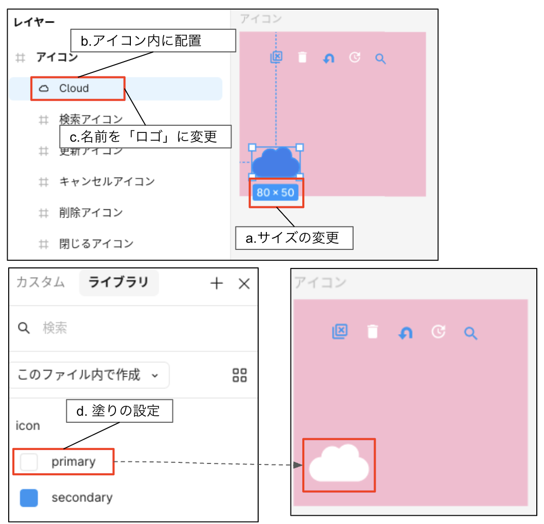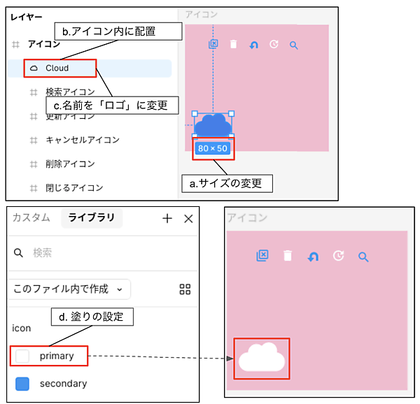 cloudアイコンをフレーム「アイコン」の下にドラッグしてください。 - c. 名前の変更