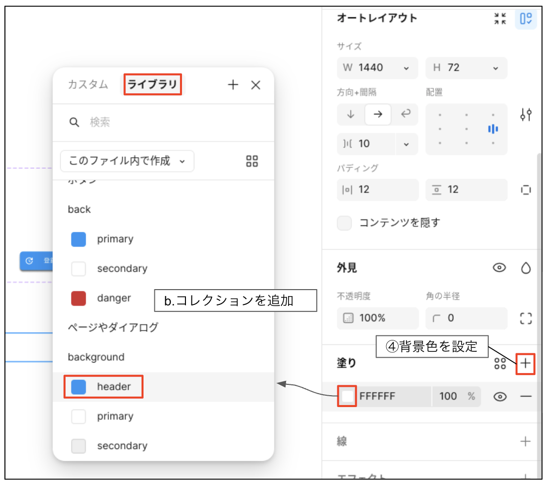 ヘッダーはプロダクトの顔なので、プロダクトのメインカラーにしましょう。これまでボタンの背景色しかバリアブルを作成していないので、ヘッダーの背景色のためのバリアブルを追加作成します。 a. バリアブルのダイアログ表示