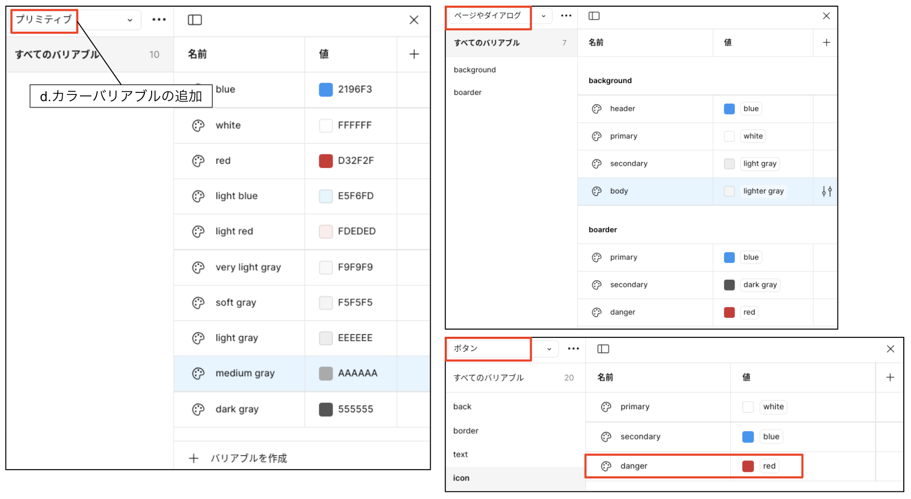 コレクション バリアブル名 値 スコープ プリミティブ blue 2196F3 なし white FFFFFF なし red D32F2F なし light blue E5F6FD なし light red FDEDED なし very light gray F9F9F9 なし soft gray F5F5F5 なし light gray EEEEEE なし medium gray AAAAAA なし dark gray 555555 なし ページやダイアログ background/header blue フレーム background/primary white フレーム background/secondary light gray フレーム background/body soft gray フレーム boarder/primary blue 線 boarder/secondary dark gray 線 boarder/danger red 線 ボタン icon/danger red シェイプ