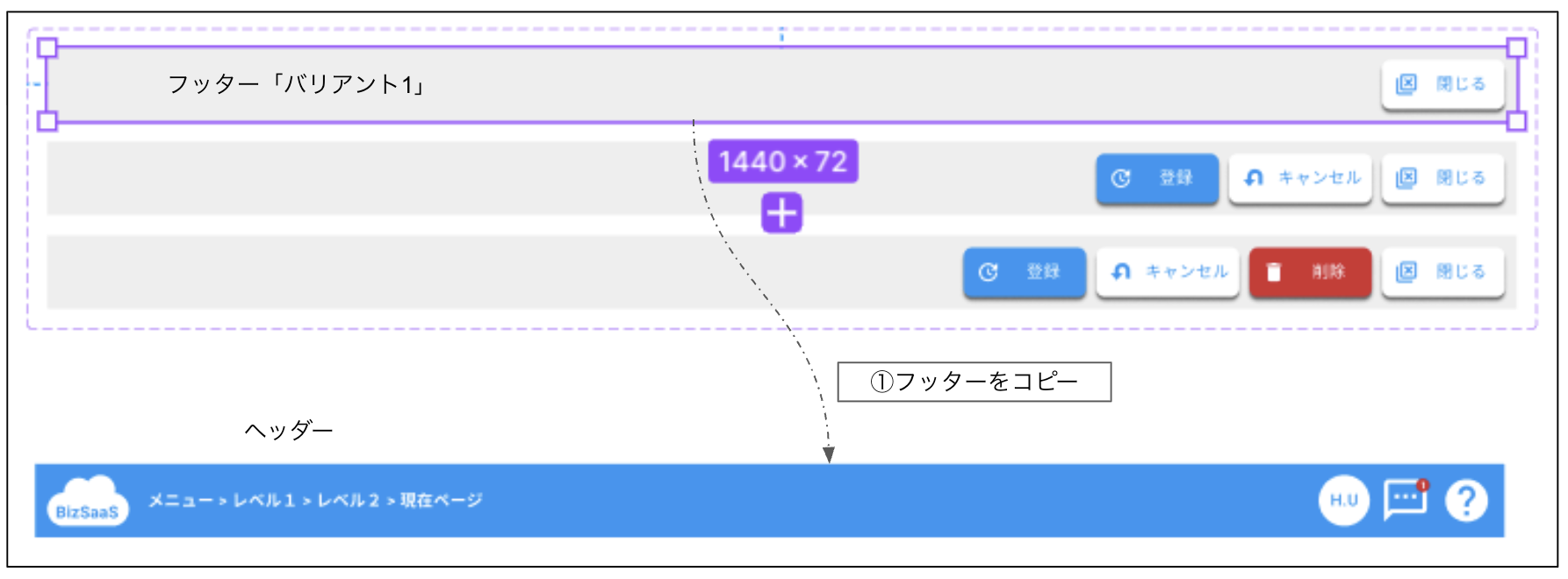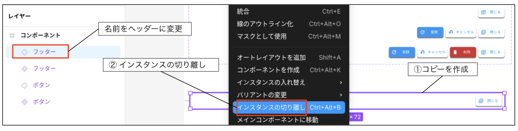 図2のフッター「バリアント1」を選択し、[alt]キー+ドラッグでバリアントグループの下側にコピーを作成します。 - インスタンスの切り離し