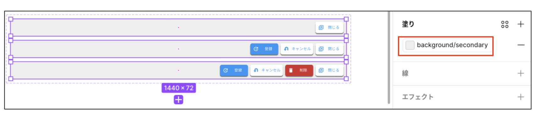 上記の方針に沿ってフッターの背景色をグレー(#EEEEEE)に指定します。3つのバリアントを一緒に選択して、図1のようにプロパティ「塗り」で「background/secondary」に指定してください。これでフッターの背景色が白からライトグレーに変更されました。