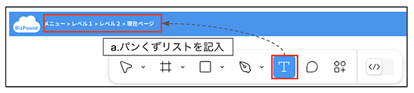 を選択し、「ヘッダー」フレームのロゴの右隣にテキストエリアをドラッグしましょう。図14のように“メニュー>レベル1>レベル2>現在ページ”というテキストを書いてください。レイアウトのサイズ変更は「幅の自動調節」にしておきます。