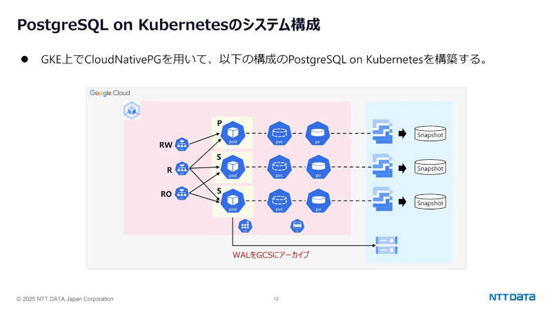 バックアップの設計にも工夫がある。ストレージにはGKEのPersistent Diskを用い、CSI(Container Storage Interface)経由でマウント。CloudNativePGの機能を活用し、ボリュームスナップショットによる定期バックアップを行うとともに、WAL(Write-Ahead Logging)をGoogle Cloud Storageにアーカイブすることで、特定時点までの復元も実現している。「CloudNativePGでは、スナップショットとWALアーカイブを組み合わせてPITR(Point-in-Time Recovery)も実現できます」と加藤氏は説明する。