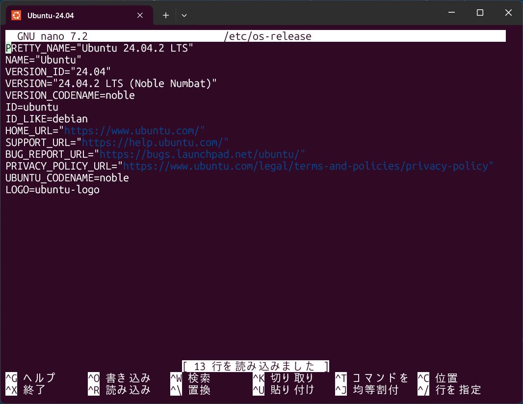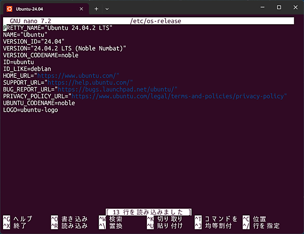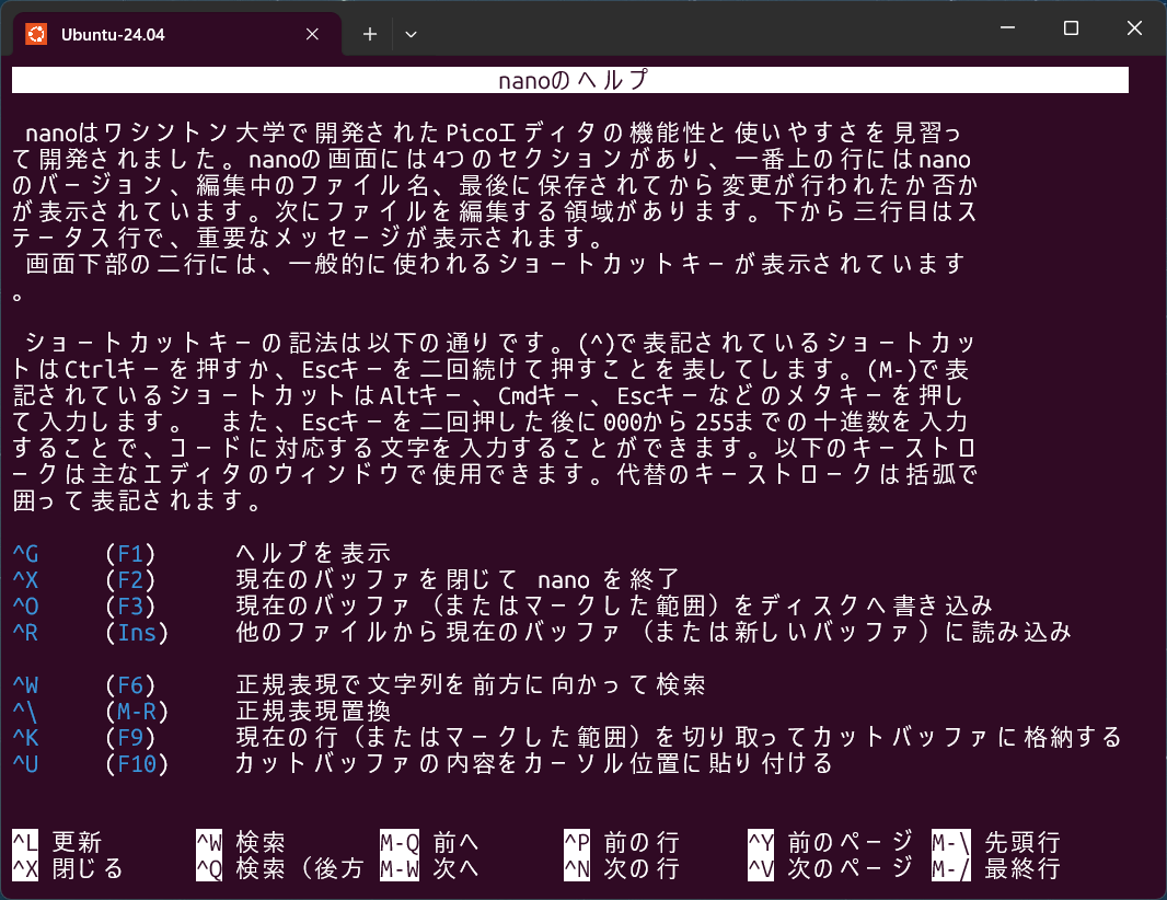 nanoにはヘルプも完備されています。「Ctrl」+「G」キーを押すとヘルプ画面が表示され、すべてのキーバインドと機能を確認できます。また、画面下部には常に主要なコマンドが表示されているため、操作に迷ったときでもすぐに確認できます。