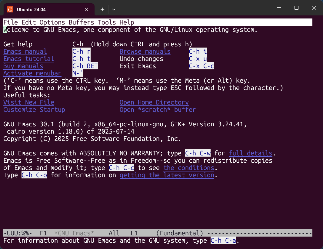 SnapからインストールしたEmacsは、GUIでも動作します。そのままemacsコマンドを実行するとWindowsのデスクトップ上でEmacsが起動してしまうため、ターミナル内で起動する場合は以下のように「-nw」オプションを付けて実行してください。