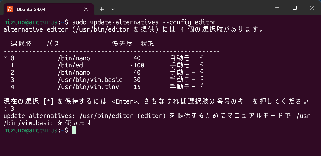 インストールされているエディタのリストと、選択肢の番号を入力するプロンプトが表示されます。デフォルトではnanoが選択されていますが、ここで「3」を入力すれば、デフォルトのエディタをvim.basicに変更できます。