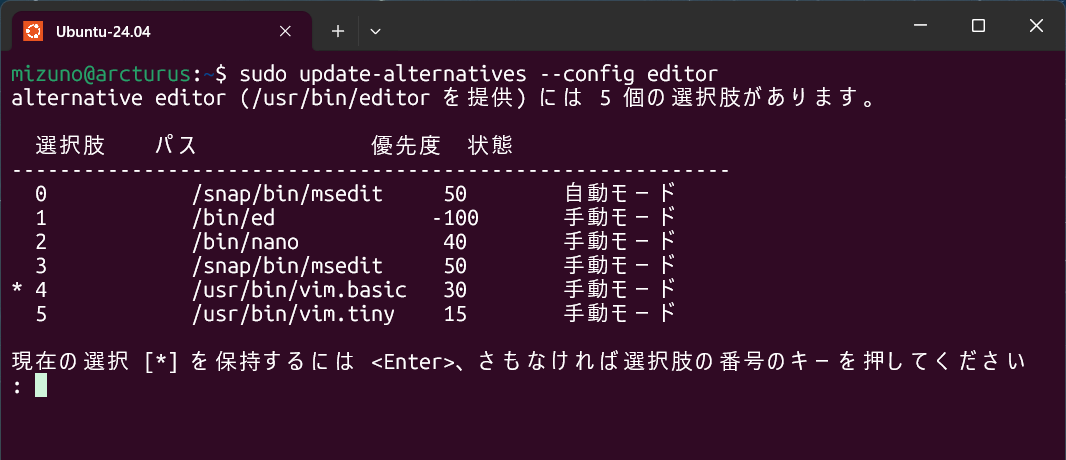 再度「update-alternatives --config」を実行してみると、mseditが追加されていることが分かります。mseditを標準エディタにしたい場合は参考にしてください。