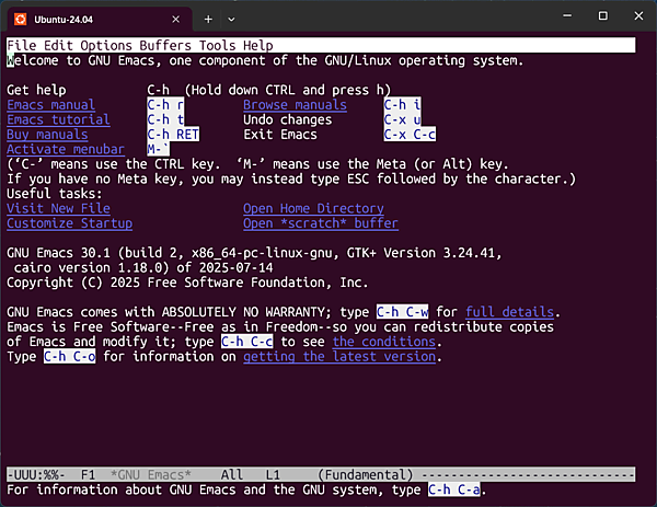 なお、EmacsはVimとは異なり「非モーダルエディタ」であるため、一般的なテキストエディタと同様に起動後すぐに文字入力が可能です。筆者は本記事を含め、ここ17年ほどの間のすべての原稿をEmacsで執筆しています。