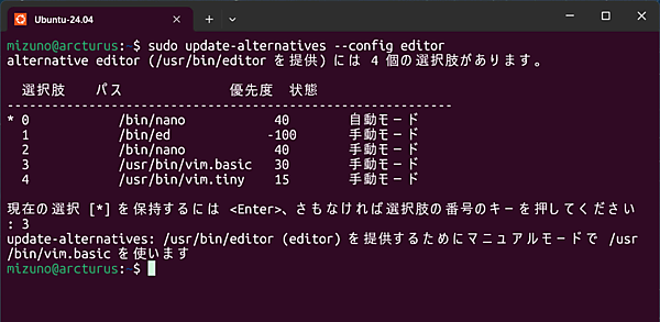 $ sudo update-alternatives --config editorインストールされているエディタのリストと、選択肢の番号を入力するプロンプトが表示されます。デフォルトではnanoが選択されていますが、ここで「3」を入力すれば、デフォルトのエディタをvim.basicに変更できます。