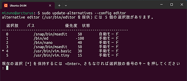 $ sudo update-alternatives --install /usr/bin/editor editor /snap/bin/msedit 50再度「update-alternatives --config」を実行してみると、mseditが追加されていることが分かります。mseditを標準エディタにしたい場合は参考にしてください。