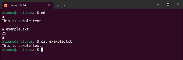 . ← ドットを入力して、追加モードを終了する入力した内容をファイルに保存するには「w」とファイル名を入力します。また、edを終了するには「q」を入力します。